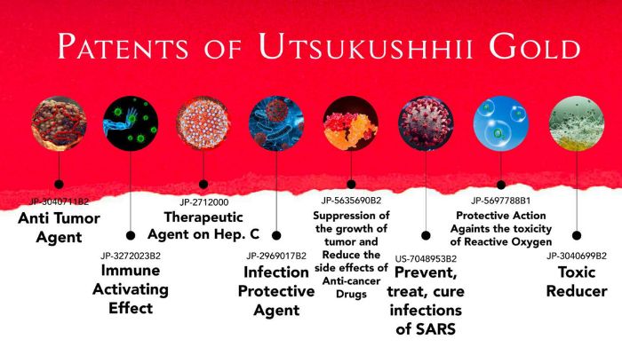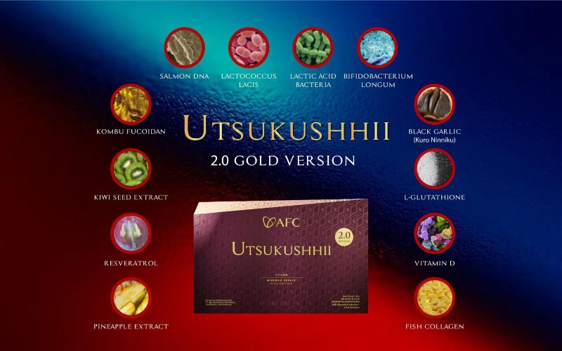 Utsukushhii Gold adalah superfood (makanan sehat) yang mengandung nutrisi tinggi yang sangat dibutuhkan oleh tubuh. Terbuat dari bahan-bahan alami. 8 Bahan utamanya antara lain : Salmon DNA, Takara Combu Fucoidan, Triple Probiotik, Bawang Hitam, Extrak Nanas, Ekstrak Kulit Anggur, Ektrak Biji Kiwi, Vitamin D dan lain lain. Utsukushhii Gold memiliki 8 paten manfaat seperti yang tertera di bawah ini :