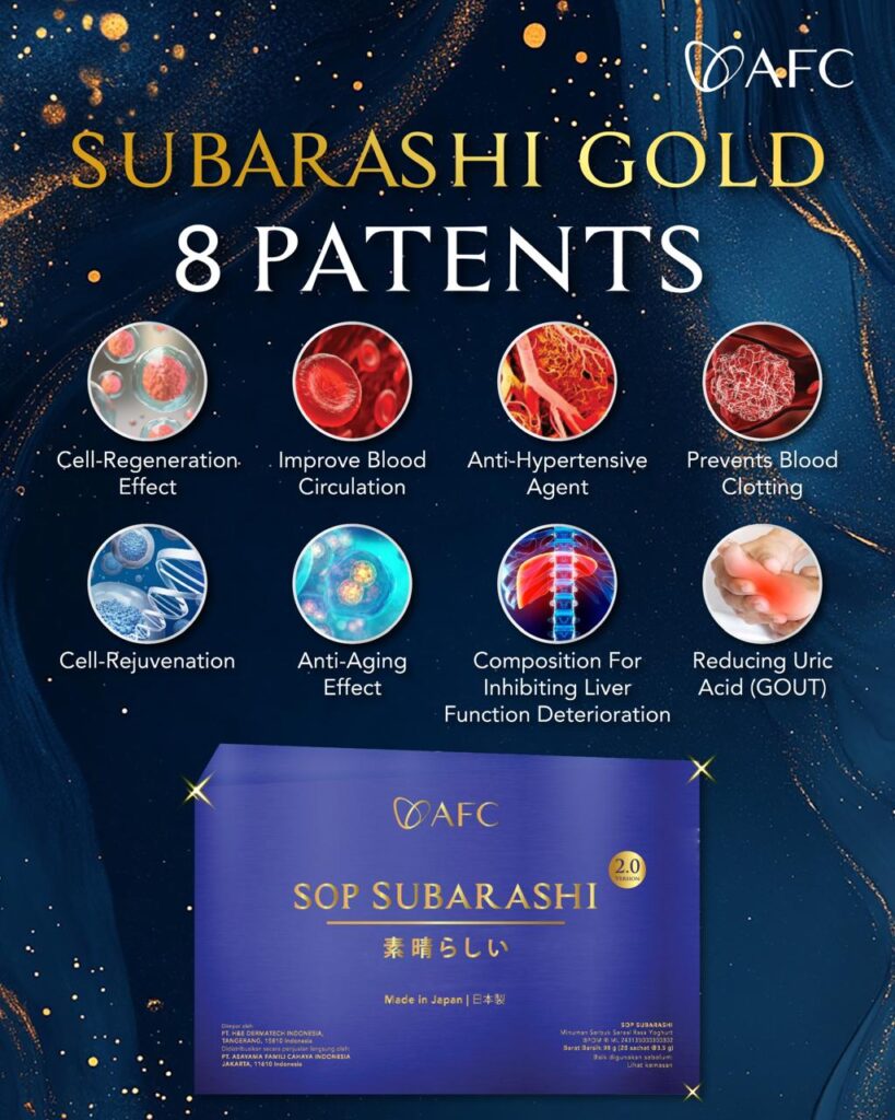 Diolah dan diproses dengan teknologi terkini Jepang sehingga menghasilkan peptida nano size 600 Dalton sehingga mudah diserap dan berfungsi maksimal dalam tubuh manusia. SOP Subarashi memiliki 8 paten manfaat, seperti yang tertera pada gambar di bawah ini :